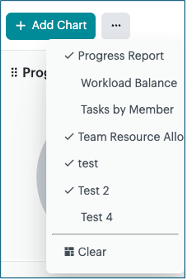 To display a hidden chart, click the “…” next to the + Add Chart button, and select the chart you want to see. The charts with a check mark are already displayed on your dashboard.