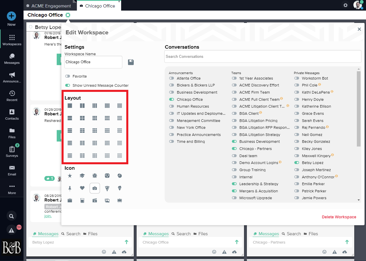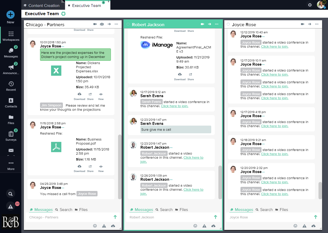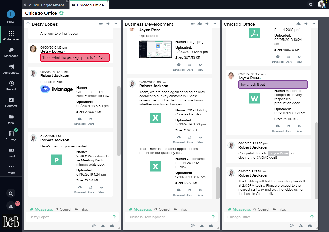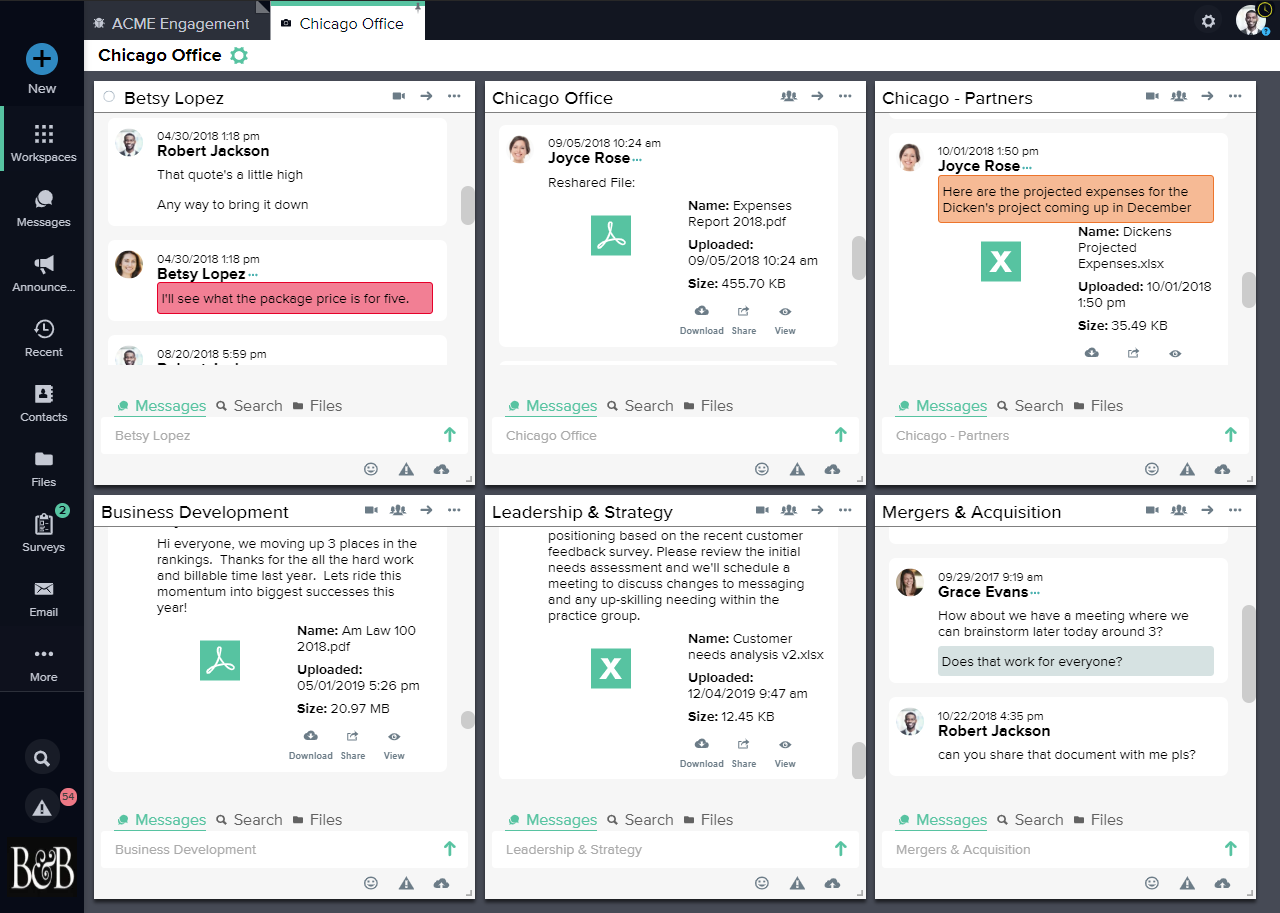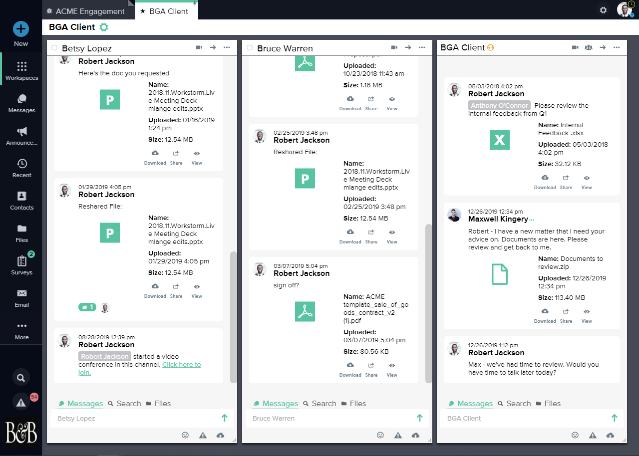 For example, Robert works with two client contacts at Client A, and he has a team of three associates who work on Client A’s account. Robert started by creating a Workspace for Client A. Then, he added to that Workspace a team message amongst him and his two clients, as well as the private and team messages he has internally amongst his associates regarding deliverables for Client A.