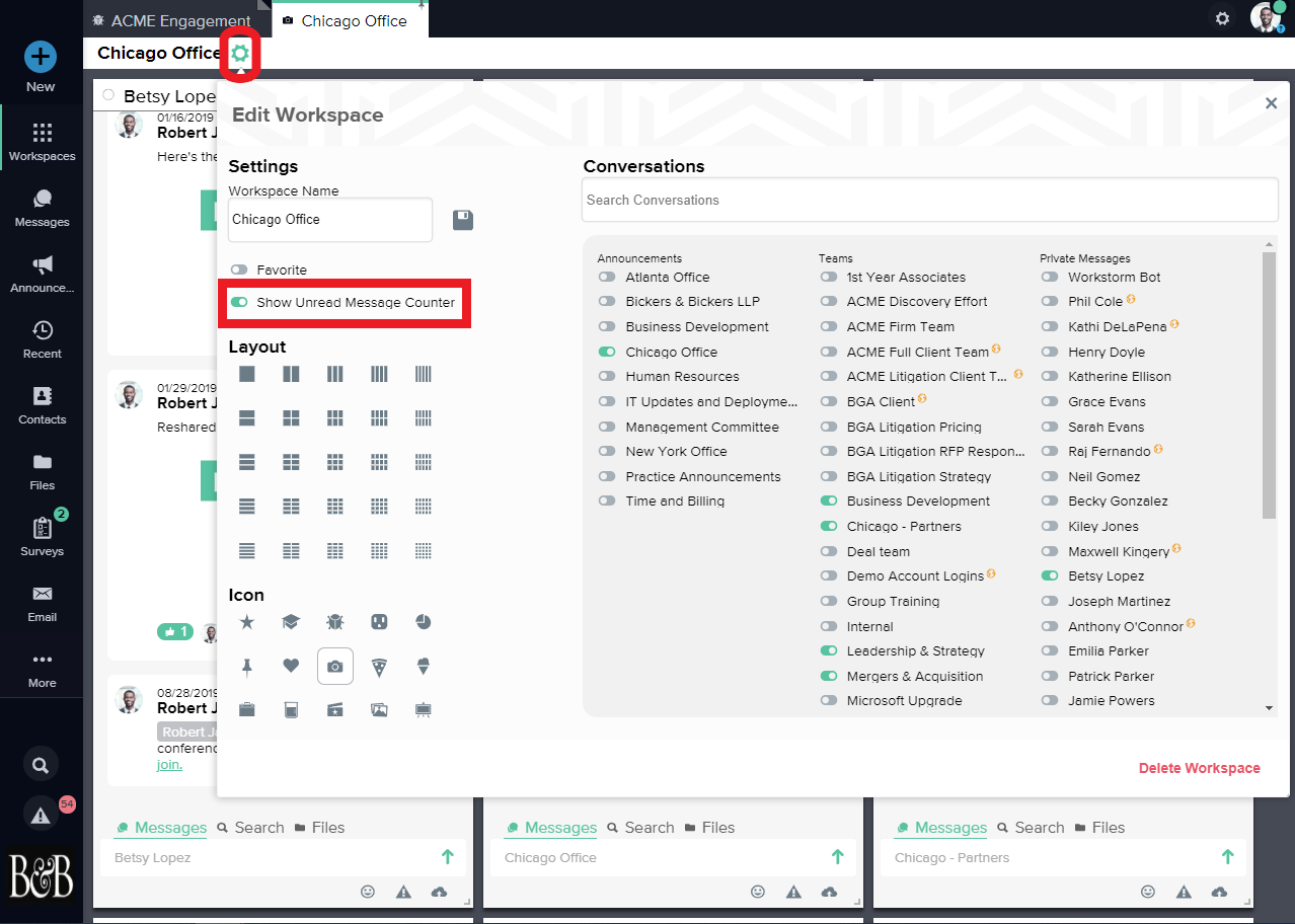 By turning on or off the message counter for each Workspace, you are able to give front-and-center visible priority to the Workspaces and messages that matter most to you, while de-emphasizing ones that require less immediate attention.