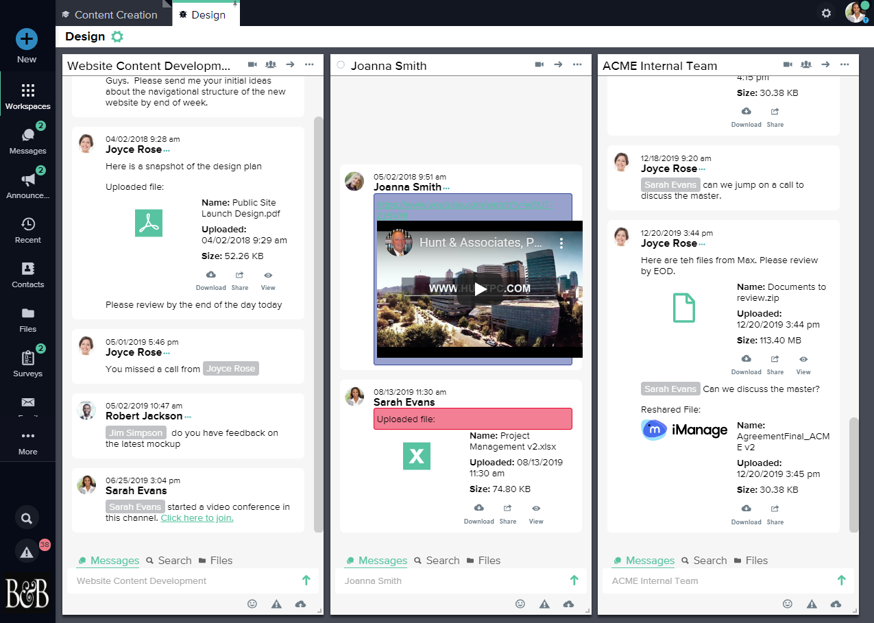 Within the Dev Team workspace, Sarah has an ongoing team message with all of her developers, as well as several private messages with individual developers, including some that are external or outside her company. This enables her to open the Dev Team Workspace, send an update to the whole team, and then send a side note assigning a task to one particular developer – all while working within the same Workspace. Sarah uses a similar structure for her Content Creation and Designers Workspaces, which include agencies, consultants or freelancers she works with.